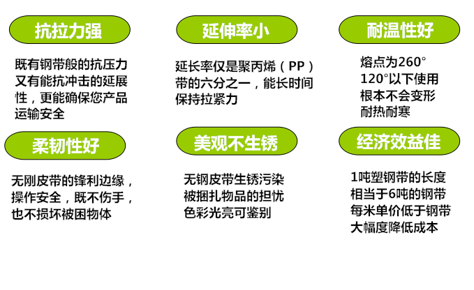 | 性能/产品 | PET塑钢带 | 钢带 | PP打包带 |